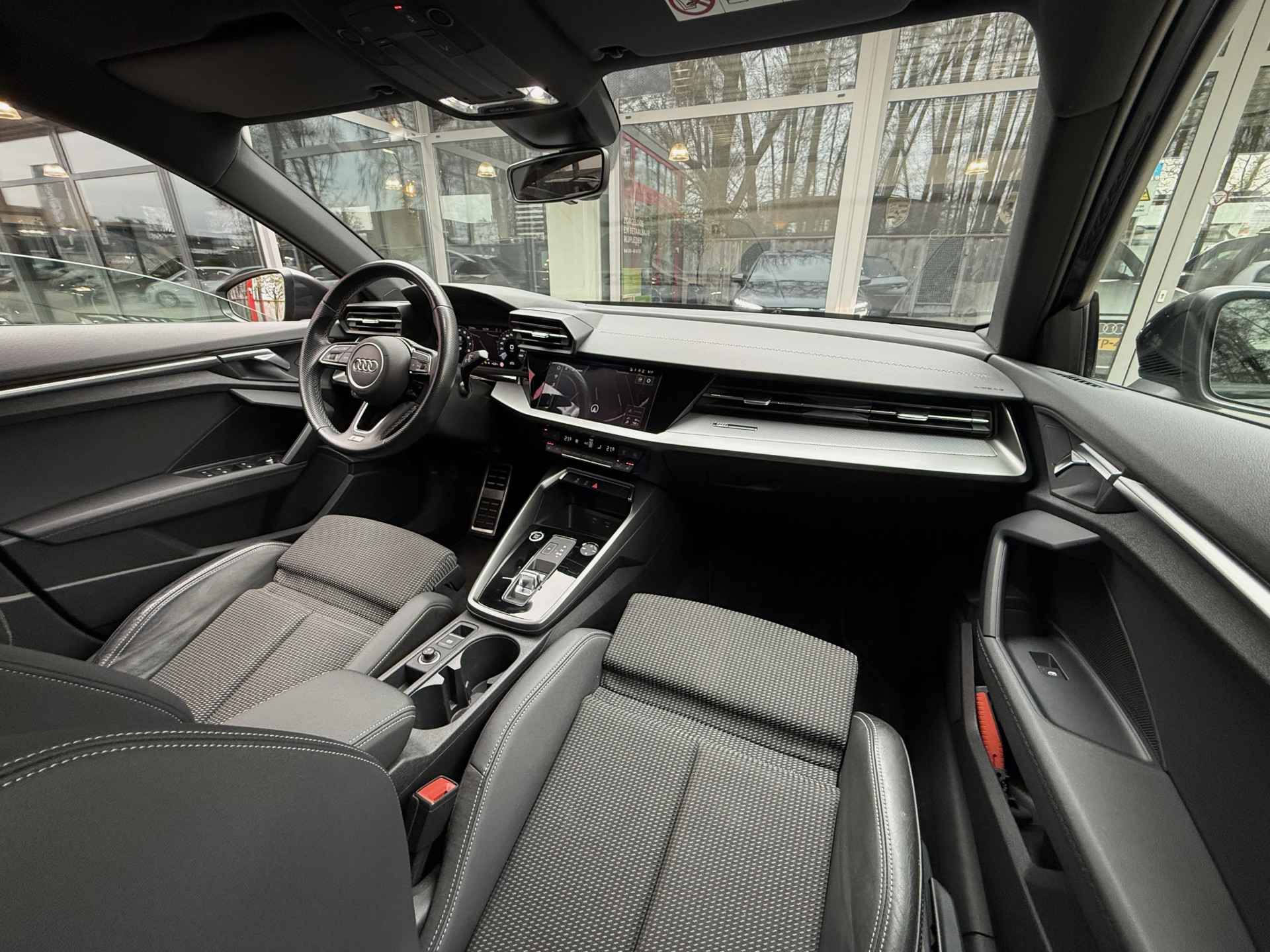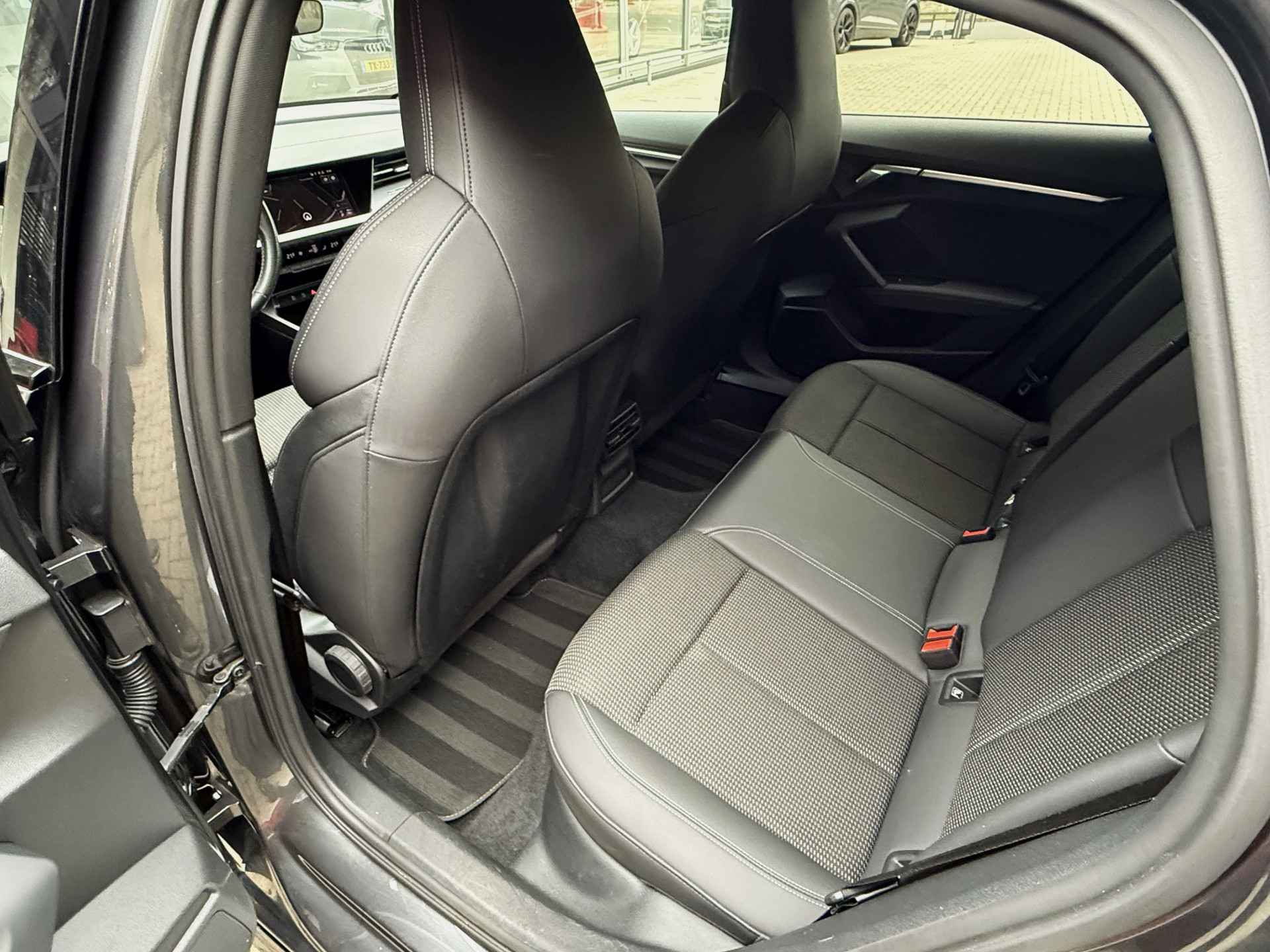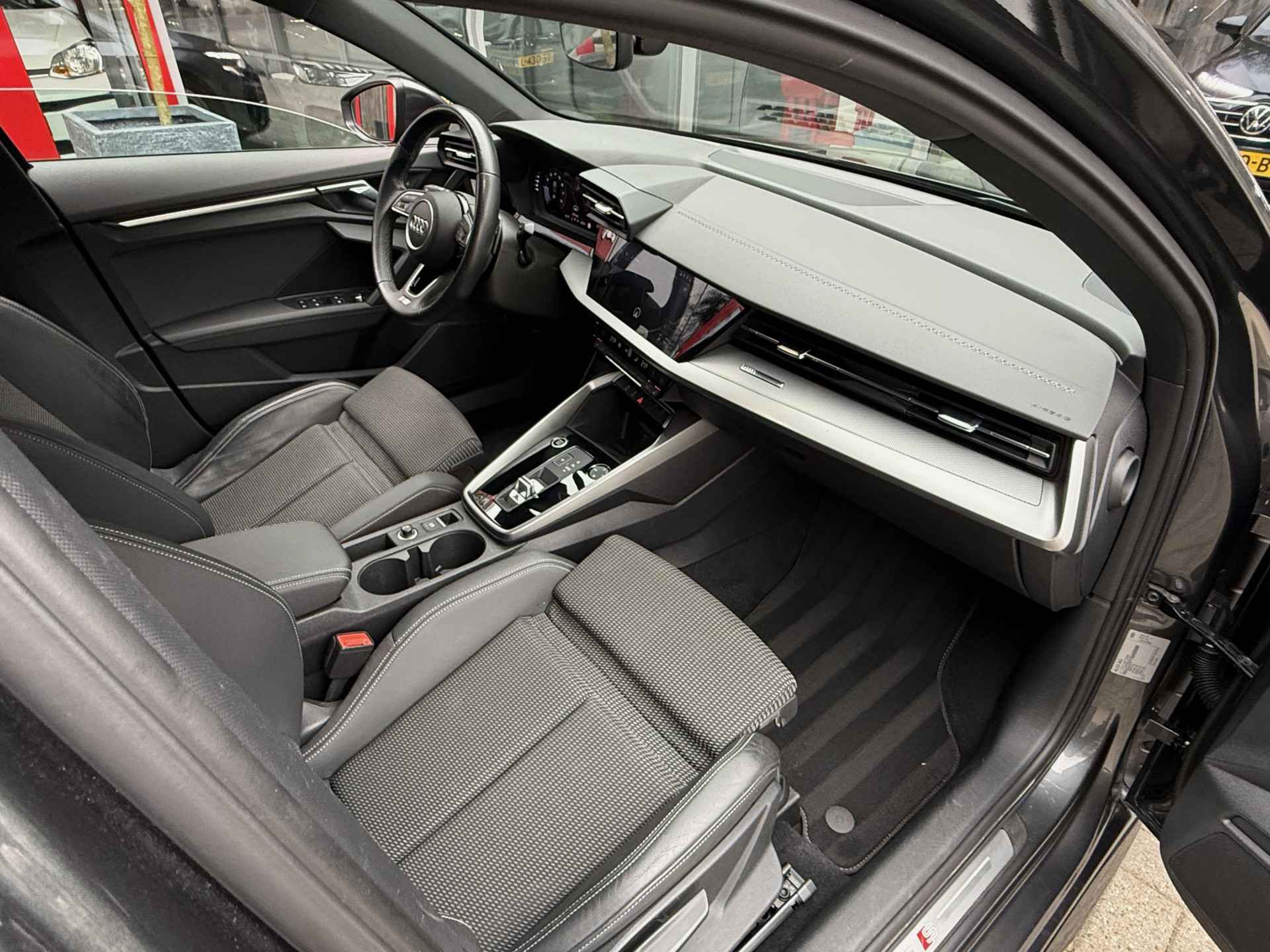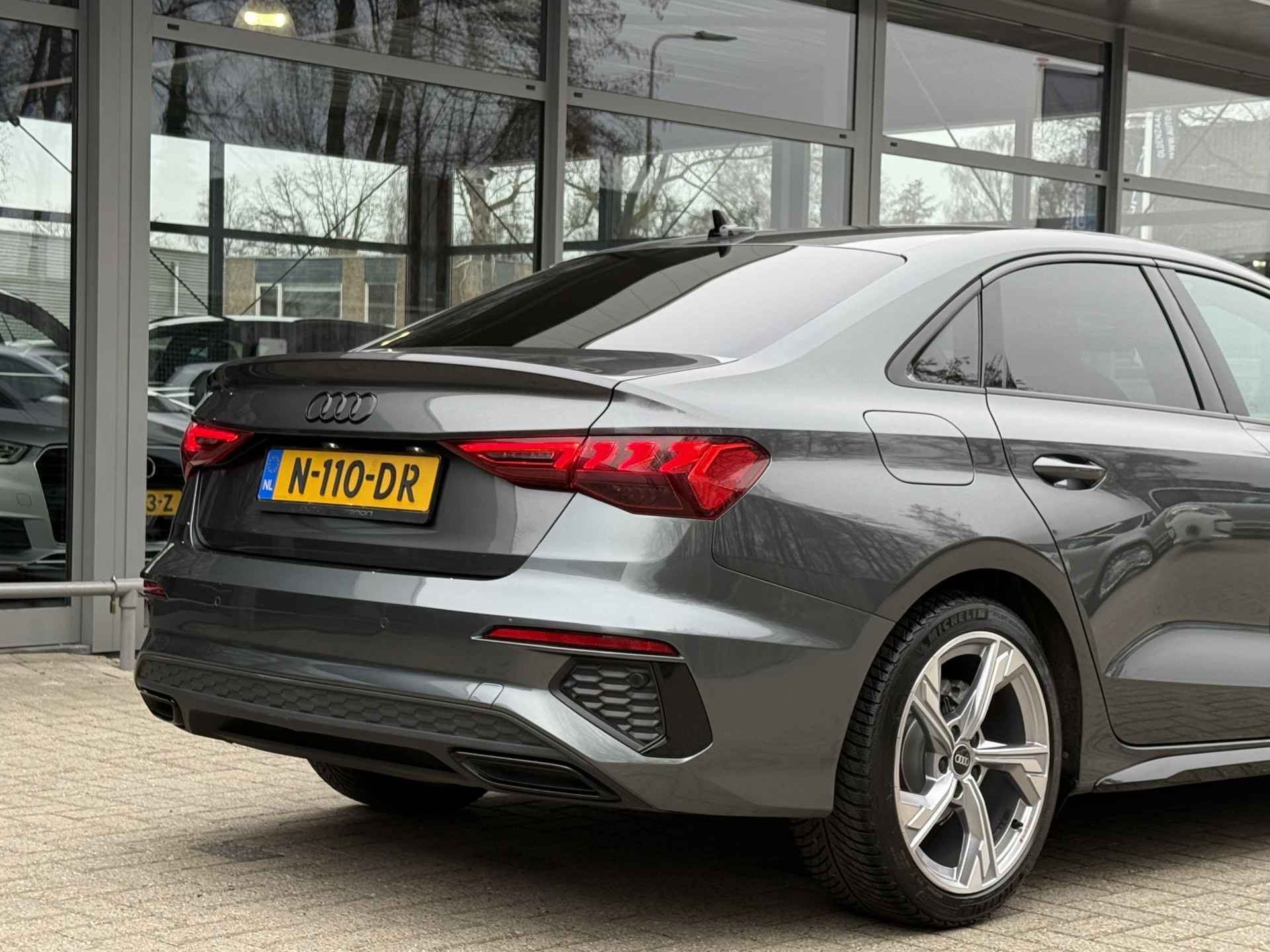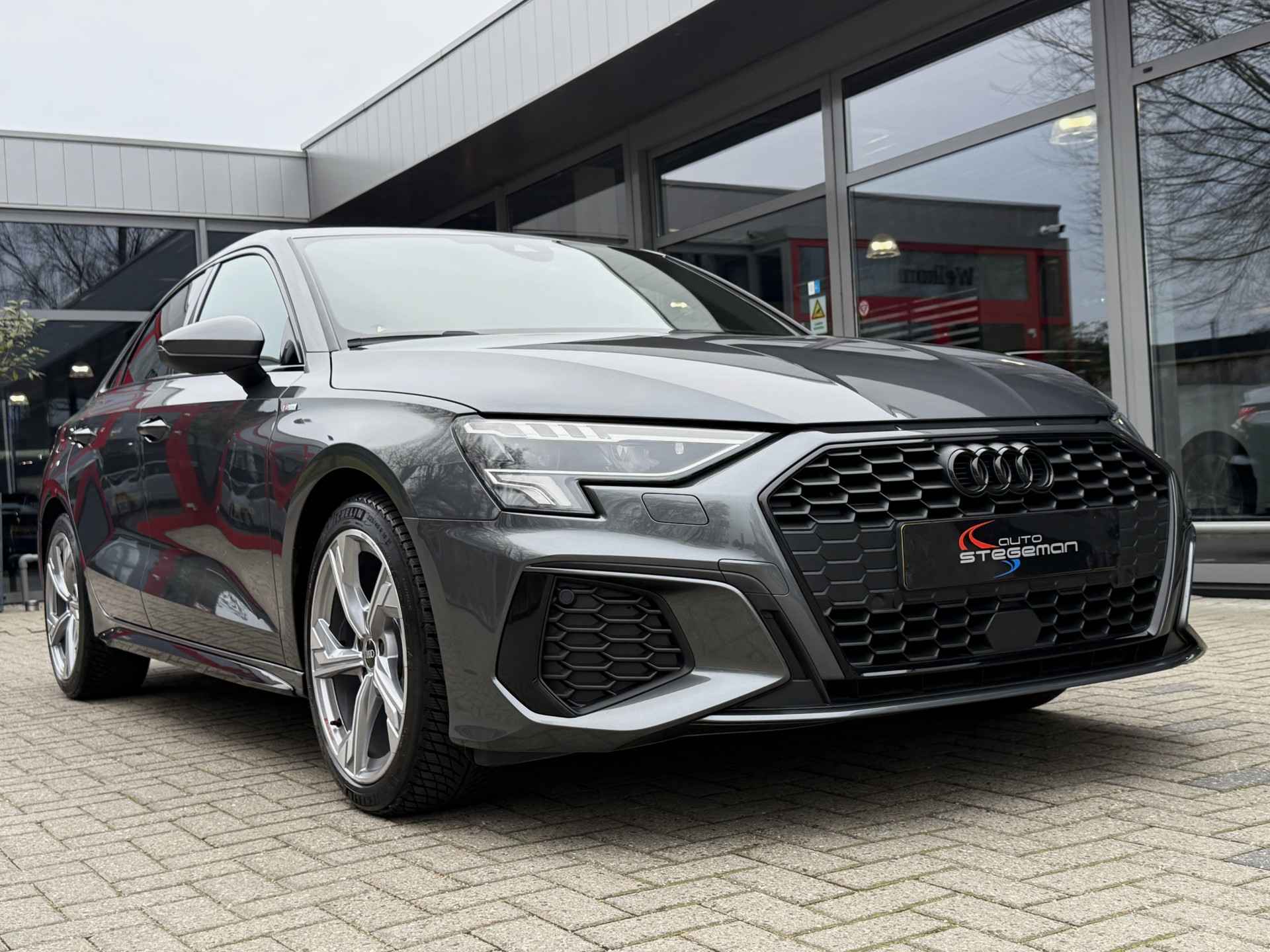 Schitterende Audi A3 Limousine met af fabriek S-Line in- en exterieur pakket!! o.a. voorzien van: Automatische airconditioning, cruise control, full map navigatie, carplay, stoelverwarming, virtual dashbord, sportstoelen leder/stof, daytona grijs metallic, black optiek pakket (exterieur delen in zwart), 18 inch velgen, privacy glas, enz.. enz..